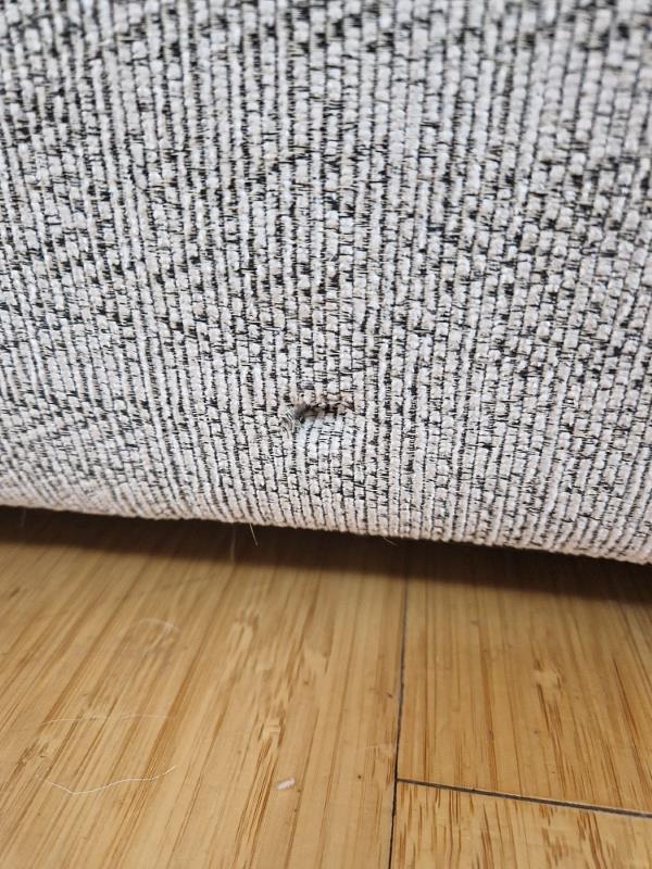 - There is a defect in the stitching of the left-arm end module, including a small hole.